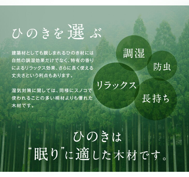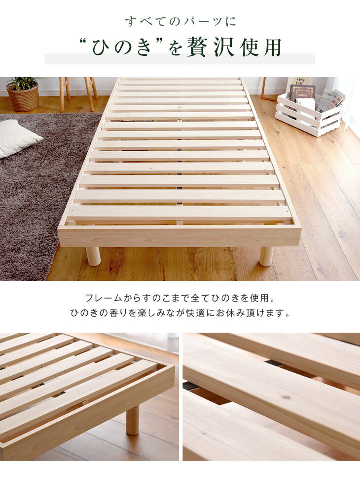 ※動画内のベッドはダブルサイズ(パイン材タイプ)を使用しております サイズ違いはコチラです 仕様サイズ 外寸:幅140.5×奥行き209×高さ63.5cm すのこ厚:1.8cm コードの長さ:190cm 【スタッフわんちゃんのおすすめポイント!】 ・香り高いひのきを贅沢に仕様したすのこベッド ・リラックス効果&天然の抗菌、調湿機能 ・ちょっとした物置に便利な宮棚付き ・寝ている間も枕元でスマホの充電が可能なコンセント2口付き ・コンセントはほこりが入りにくくより安全なスライド式 ・雑誌などを収納できるブックシェルフ付きヘッドボード ・通気性抜群のすのこ仕様だから年中快適 ・敷布団でも使える幅広しっかりすのこ ・脚を取り外して3段階の高さ調節が可能 ・フレーム幅しっかり80mm ・子供にも安心・安全のFフォースターランクの接着剤を使用素材 ひのき耐荷重 200kg重量約41kg梱包サイズ 144×50×16.5cm 136×26.5×22cm生産国 ベトナム(檜材:日本産)※檜の産地について:日本の産地(時期により地域は異なります)より檜材をベトナムに輸出して生産し、再輸入しています。