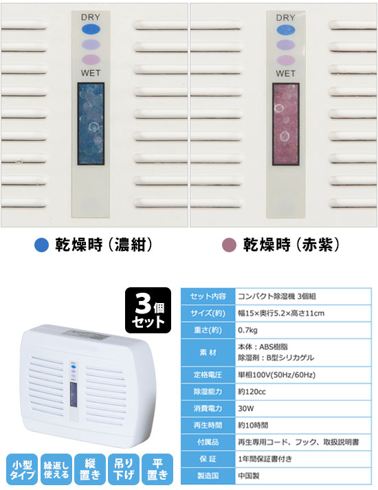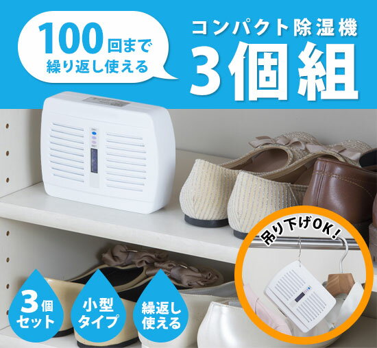 コンパクト除湿機 3個組 03866 約100回まで繰り返し使える!タンスなどの狭い場所にもおすすめコンパクト除湿機 3個組 03866 ●狭い場所の湿気対策・防カビに便利なコンパクト除湿機 ●タンス・下駄箱・クローゼットなどで使える小型除湿機 箪笥(たんす)や下足箱、押し入れの除湿に除湿剤を使っていませんか?このリピート除湿機なら、面倒な取り替えも必要ありません。